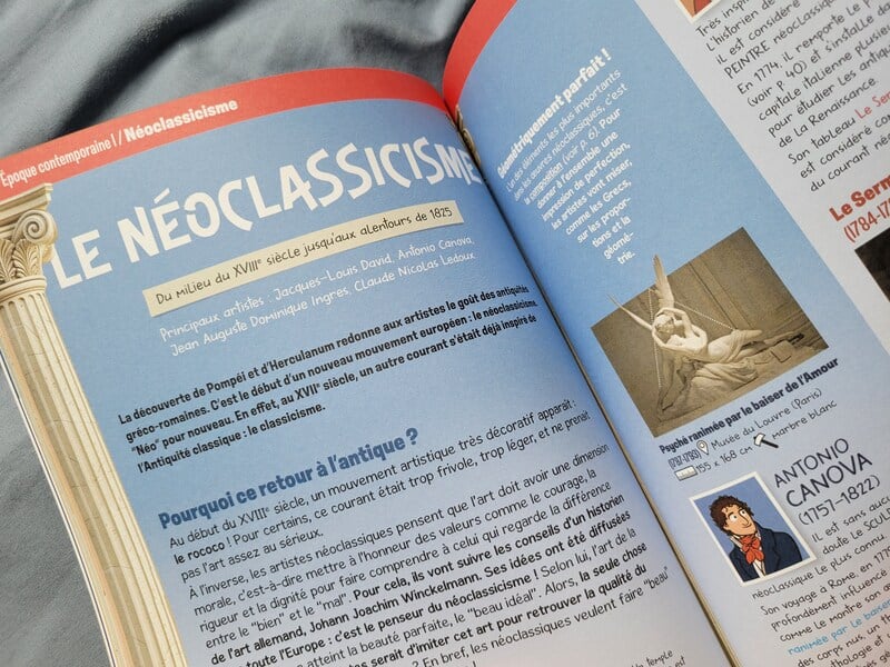 Chronologique et découpé selon les grands mouvements artistiques d’Europe (on fait aussi un petit tour du côté de l’Égypte et de la Mésopotamie), chaque double page explore un mouvement artistique : art préhistorique, art byzantin, maniérisme, néoclassicisme, cubisme, etc.